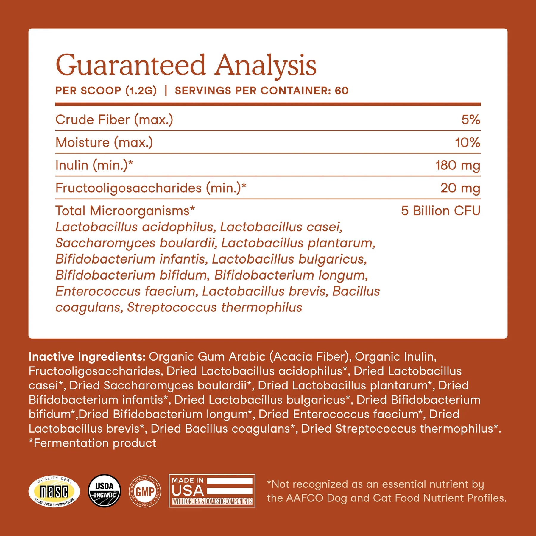 Our veterinarian-formulated probiotics include organic prebiotics that support normal microbial balance and the growth of beneficial bacteria in your pet's intestines.
