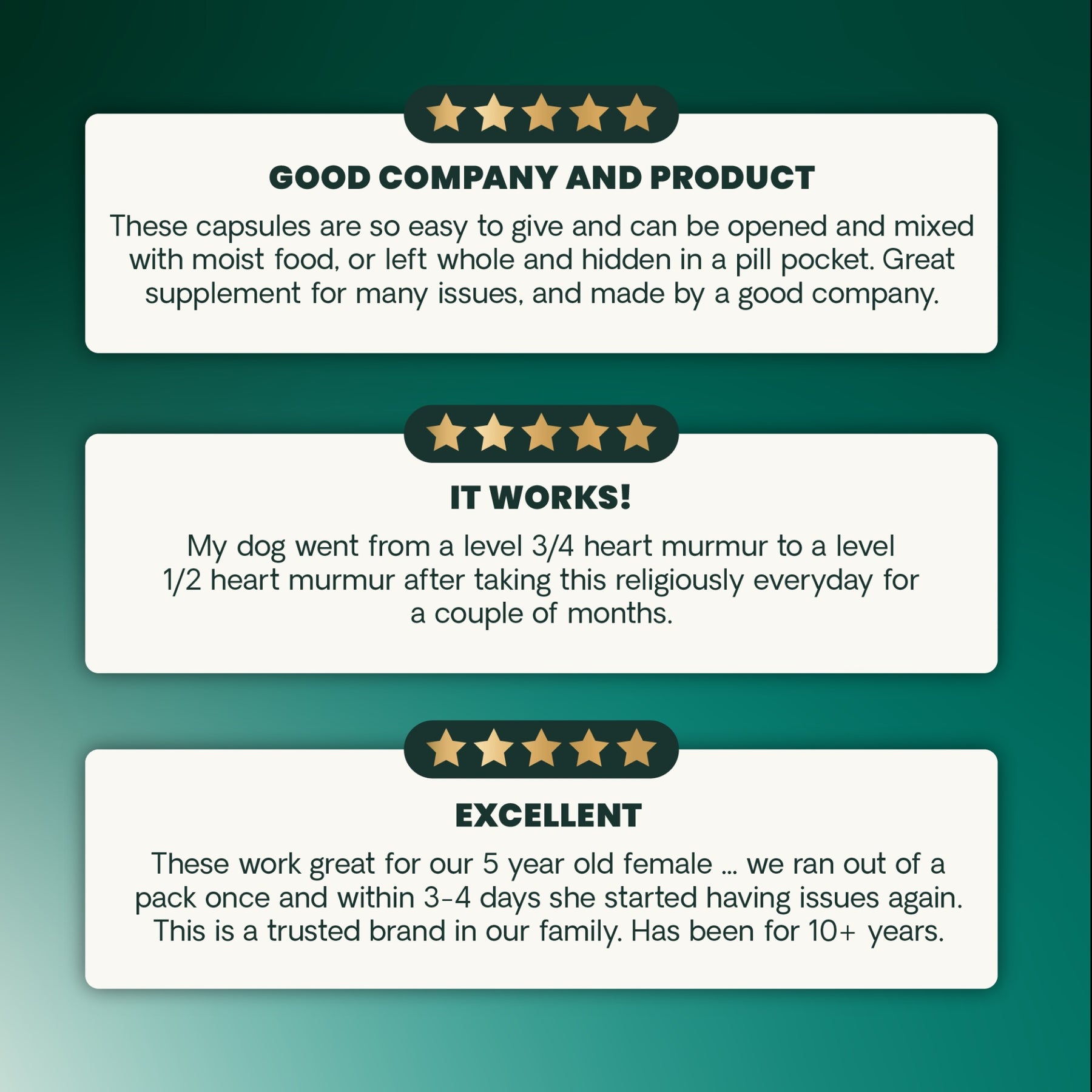 Our CoQ10 Healthy Heart supplement for dogs & cats comes in convenient non-dairy capsules that are ideal for picky or sensitive pets. They can be given directly by mouth, hidden inside of a pill-hiding treat, or the powder can be sprinkled over your pets meal. The capsules also contain few added ingredients and calories.