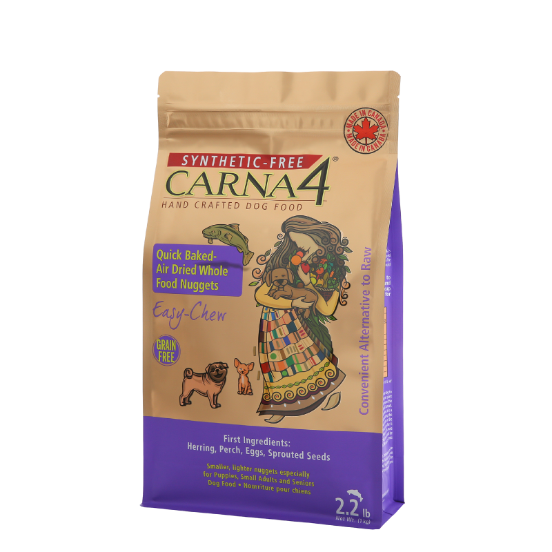 Carna4 Easy-Chew Fish variety is whole food nutrition for all life stages of your dog customized with a slightly softer, smaller nugget – perfect for the little mouths of puppies and small breeds, as well as older dogs that have trouble with chewing. Carna4’s delicious air-dried nuggets are highly digestible and so densely packed with whole foods that you may need to feed 10-15% less per day than you are used to. Our Fish formula is loaded with fresh wild-caught herring and perch. We then add whole produce and our amazing mix of certified organic sprouted seeds that have been germinated to unleash a POWERHOUSE of NUTRIENTS naturally, to support your dog’s intestinal health, energy, skin and coat. We then quick-bake & gently dry it to give your dog bio-available vitamins and minerals, without synthetic additives of any kind. No vitamin pre-mix needed nor added, ever.