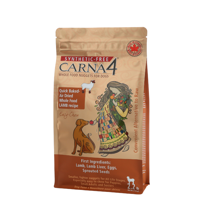 Carna4 Easy-Chew Lamb variety is whole food nutrition for all life stages of your dog customized with a slightly softer, smaller nugget – perfect for the little mouths of puppies and small breeds, as well as older dogs that have trouble with chewing. Carna4’s delicious air-dried nuggets are highly digestible and so densely packed with whole foods that you may need to feed 10-15% less per day than you are used to. Our Lamb formula is loaded with pastured New Zealand lamb. New Zealand has some of the cleanest agriculture in the world and is a BSE-free country. We also include whole produce and our amazing mix of certified organic sprouted seeds that have been germinated to unleash a POWERHOUSE of NUTRIENTS naturally, to support your dog’s intestinal health, energy, skin and coat. We then quick-bake & gently dry it to give your dog bio-available vitamins and minerals, without synthetic additives of any kind. No vitamin pre-mix needed nor added, ever.