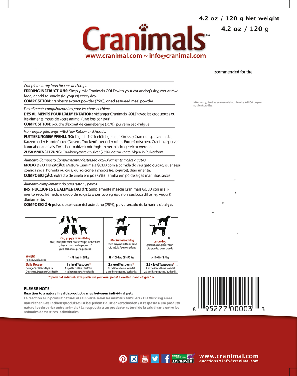 CRANIMALS™ GOLD combines our Original cranberry extract with DHA (Docosahexaenoic Acid), a long chain Omega 3 fatty acid extracted from a sustainable source of microalgae. DHA Omega 3 is a natural anti-inflammatory important for neurological, skin, brain, eye, and heart health in developing puppies and kittens. The Omega 3 in Cranimals Gold is used up by animal metabolism immediately, in contrast to short chain Omega 3 acids (eg, [ALAI Alpha Linolenic-acid found in flax oil). In fact, it may take up to 37 grams ALAS (found in flax) to make the same amount of DHA found in 1 gram of Cranimals Gold, CRANIMALS™ Gold contains the antioxidant beta carotene - for healthy eyes, skin, membranes and immune function: choline - for proper cell signaling, mental acuity and joint health: and antioxidant anthocyanins - for urinary tract health. CRANIMALS™ Gold packs a powerful punch!