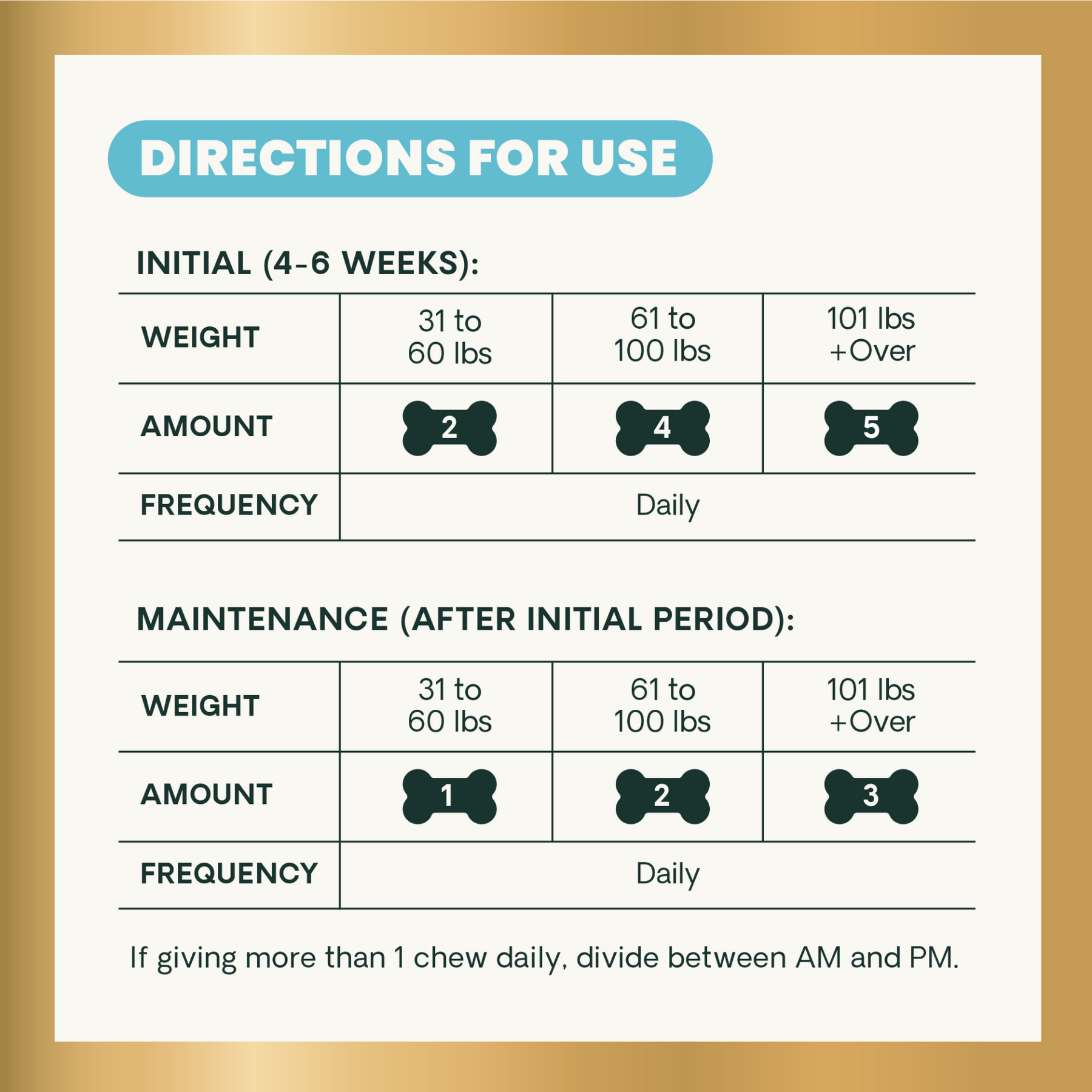 + If giving more than 1 chew daily, divide between AM and PM.